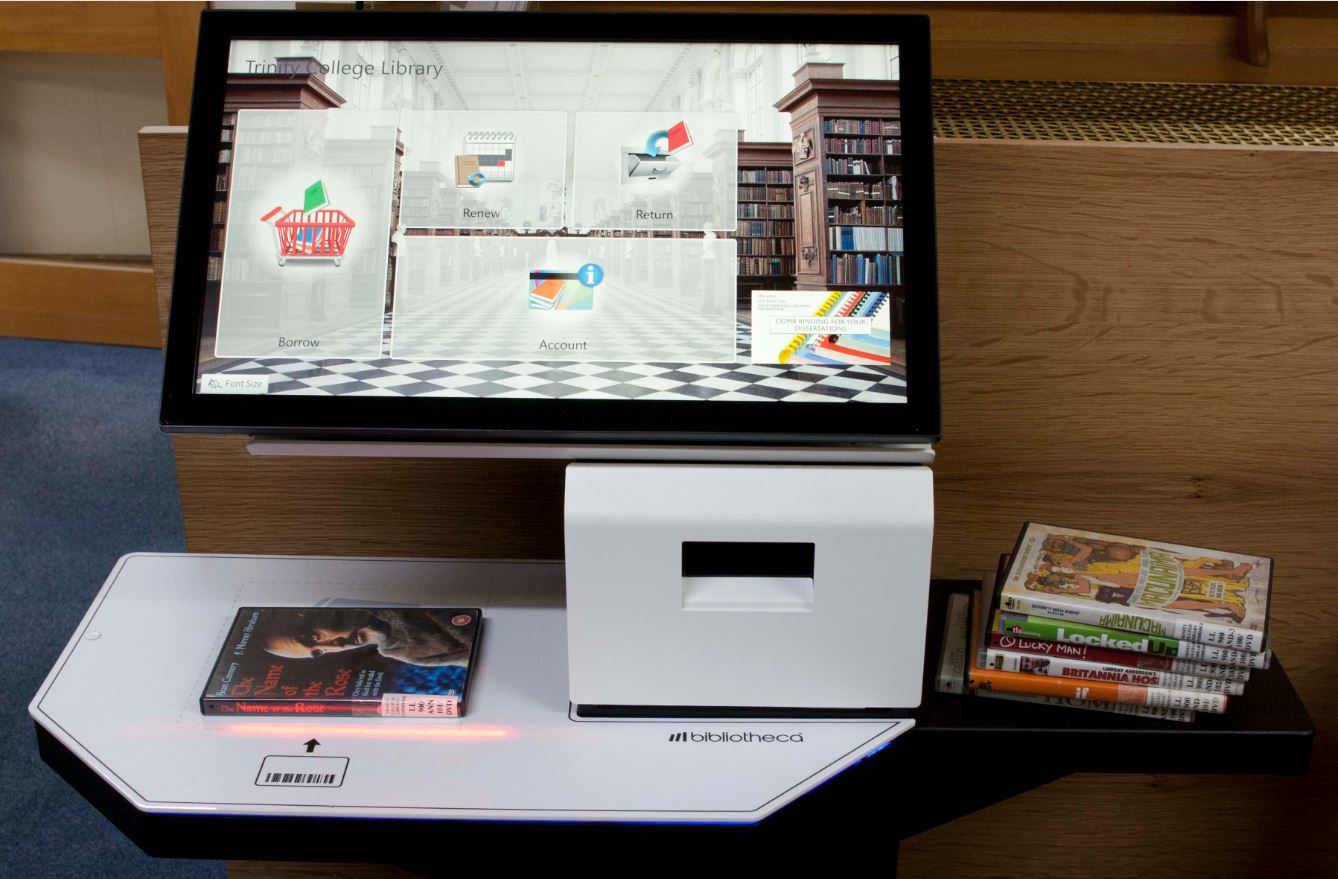 To borrow books and other items, you need to use the self-issue kiosks in the Catalogue Room. You will need to have your University card handy, as you will be asked to scan it to access your Trinity Library account. Once in, just place the books on the scanner and they will be added to your account.