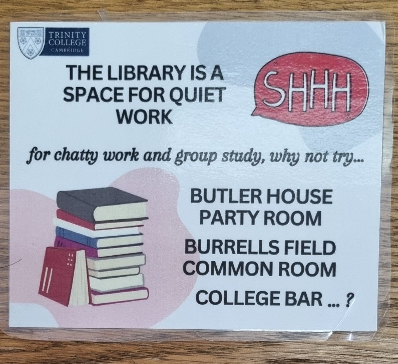• CCTV: The Library is under CCTV surveillance. Images are monitored for the purpose of crime prevention under a scheme operated by Trinity College, Cambridge. For further information contact (01223) 338400.