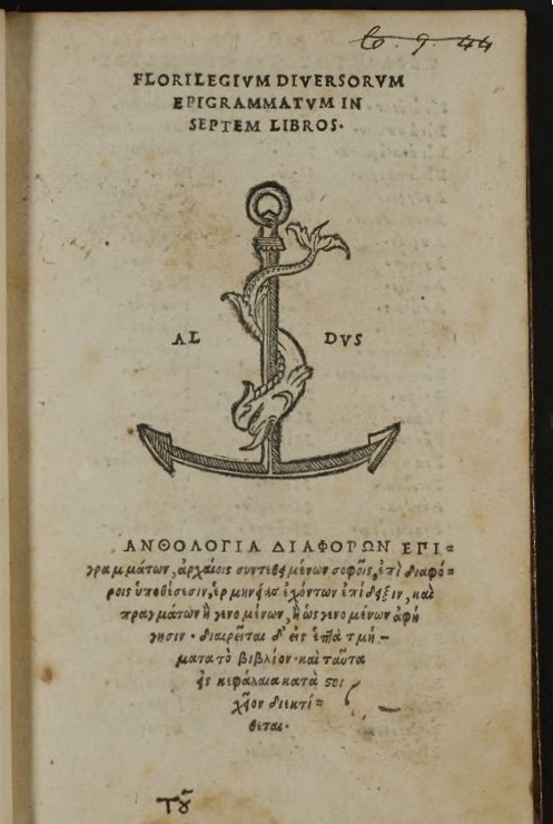 Aldus Manutius’s colophon from a Greek anthology printed in Venice in 1503 (M.12.17)