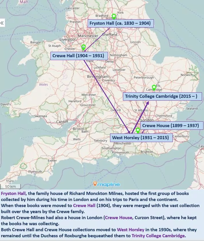 The Crewe collection consists of over 7,500 books bequeathed by Mary, Duchess of Roxburghe (1915-2014). Her father, Robert Crewe-Milnes and grandfather, Richard Monckton Milnes both studied at Trinity before embarking on important political careers. Between the 1830s and the early twentieth century they amassed an extraordinary library and one of the most important private collections in Britain. The collection includes major works of English and French literature, rare political pamphlets, trial transcripts and several unpublished literary manuscripts, as well as first editions inscribed by Byron, Shelley, Wordsworth, and Tennyson. Over half of the collection is works in French, reflecting Monckton Milnes’ particular interest in the French Revolution. Cataloguing work on the Crewe collection is ongoing.