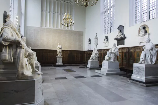 Members of the College who died in the two world wars are commemorated in the Chapel, with individual information available on the Chapel website. The memorial to the 384 men who lost their lives in the Second World War is on the west wall of the Antechapel, behind the statue of Newton. Each person’s name was engraved by David Kindersley in 1951.