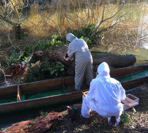 Head Gardener, Tom Hooijenga, explained, ‘When light improved, we noticed honeycomb visible in one of the cavities of the tree that was now lying in the water.’ As the tree surgeon tackled the fallen willow with a chainsaw, bees emerged from their hideout.