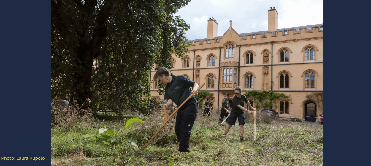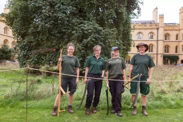 In 2019, the Gardens Team planted 14 types of wildflower in the turf encircling a pink chestnut tree. At a special event for College members on 22 September, Trinity gardeners Joharna Richards and Jo Miles, Trinity Fellow Professor Marian Holness, and Head Gardener at Clare College Kate Hargreaves – all trained scythers – scythed the Meadow Circle.
