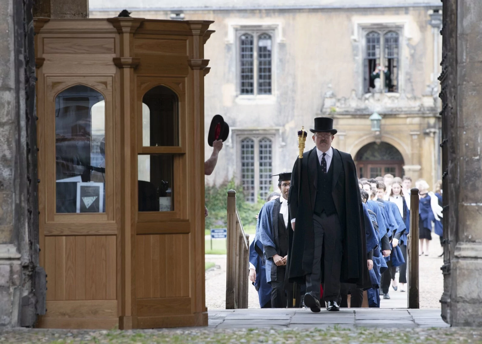 Arranged according to the rules of General Admission, with Engineering and Natural Sciences students up front, the graduands were led out of Great Court in pairs by the Interim Head Porter Frank Barker, equipped with the College staff, and the Praelector.