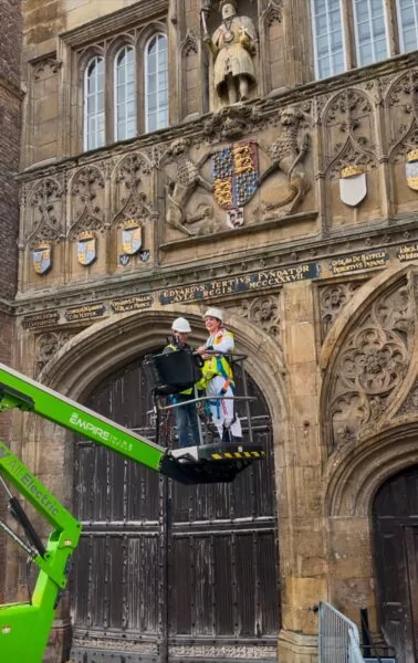 Olympic gold medalist Imogen Grant returned to Trinity and collected another medal – this one of plywood and MDF – from around Henry VIII’s neck at Great Gate via a cherry picker and amid cheers from the crowd below.