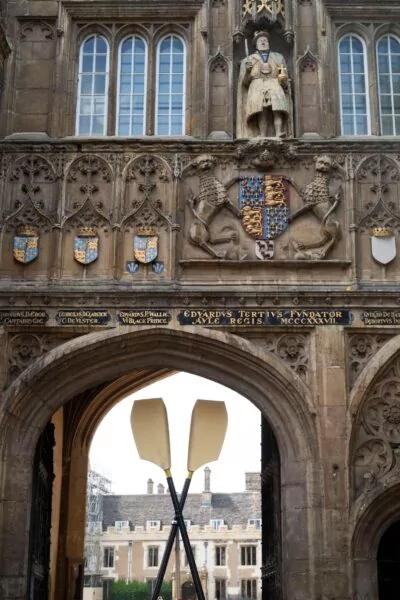 Oars painted gold and Henry wearing the replica medal on display at Great Gate. Photo: Trinity College Cambridge